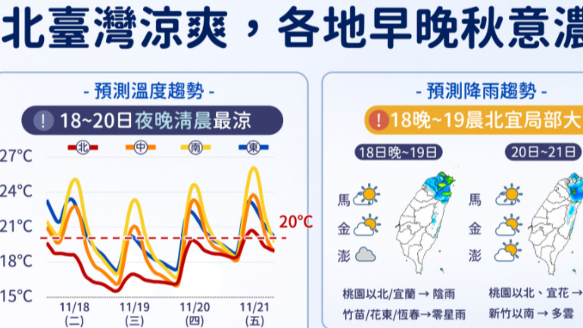東北季風影響,降溫明顯,北台灣的民眾幾乎都穿上厚重外套,不過強度也持續減弱中,中央氣象署預報員賴欣國表示,今晚至明天清晨這波冷空氣較強,西半部、宜蘭清晨低溫僅15、16度,但白天高溫就會回升至22度,因此明天(11/20)清晨外出,仍要注意保暖措施。另外,這周末雖然天氣回穩,但下一波東北季風將從下週一(11/24)開始影響台灣,恐再感受明顯降溫5天。