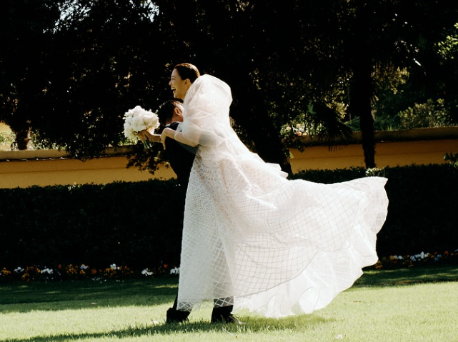 不知道是否因為週刊報導讓婚訊提早曝光,林又立今天傍晚在社群網站上發文,僅低調寫下「謝謝大家的祝福」,更曬出一系列穿著白色婚紗的照片,只見身材高挑的她穿著平口剪裁、鋪滿水鑽的白色婚紗,與黑色西裝的老公在草原上擁抱、開心大笑,而婚紗也設計高衩露出她修長的美腿,讓人十分驚艷。