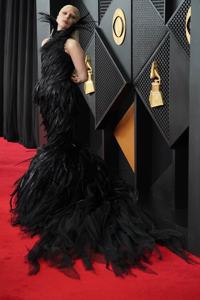 女神卡卡(Lady Gaga)以一襲黑色羽毛禮服登上葛萊美獎紅毯,氣場十足。美聯社