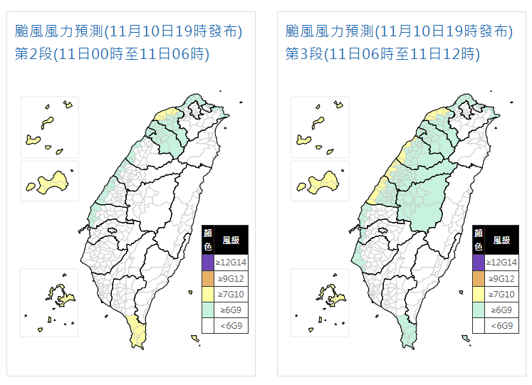 在風力預測方面,11日上午6時至12時達標區域為:桃園市濱海鄉鎮、苗栗縣濱海鄉鎮、台中市濱海鄉鎮、彰化縣濱海鄉鎮以及連江、金門、澎湖。