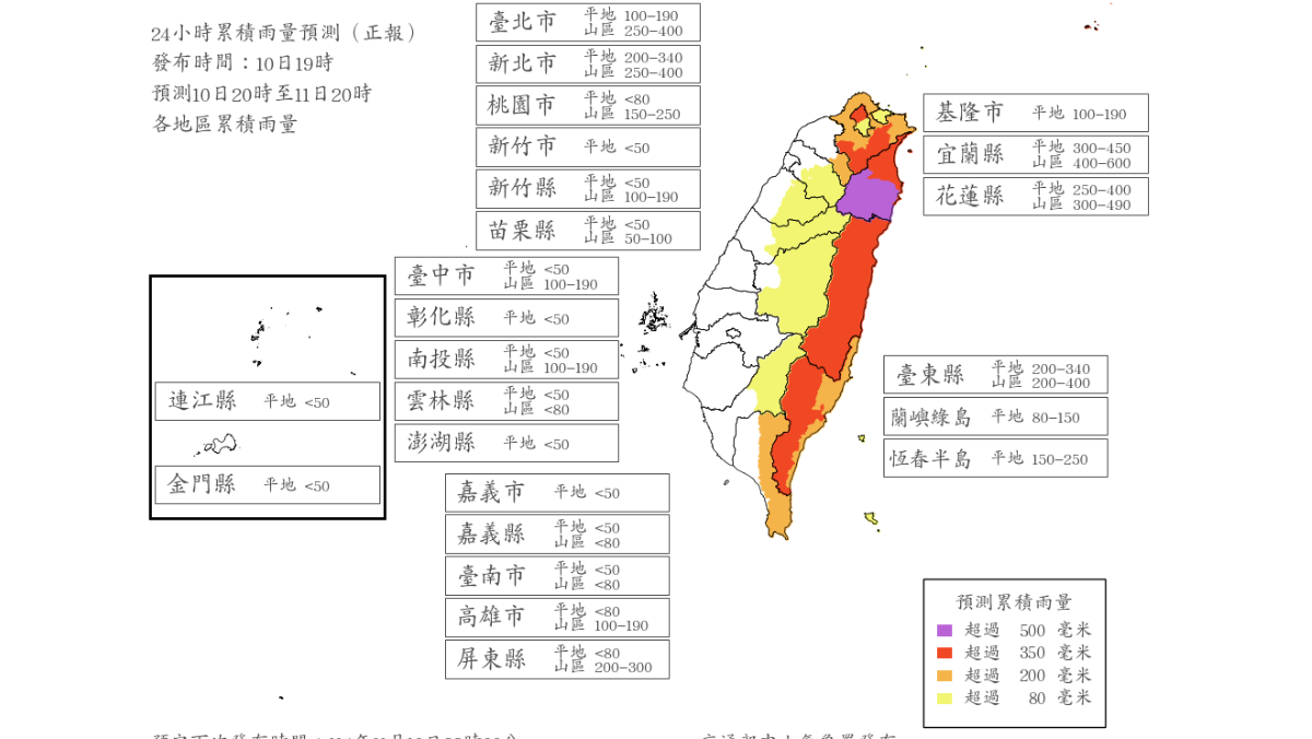 在雨量預測部分,依10日20時至11日20時的24小時雨量,達標區域為:台北市山區、新北市山區、桃園市山區、宜蘭縣、花蓮縣、台東縣山區。