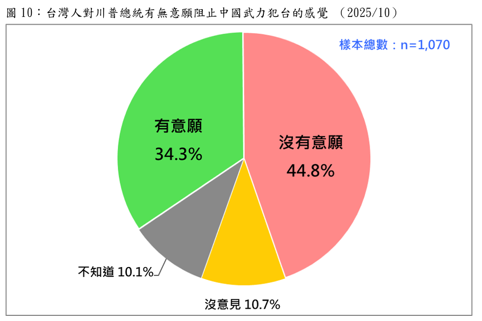 高達將近4成5民眾認為,川普無意願阻止中國武力犯台。台灣民意基金會提供