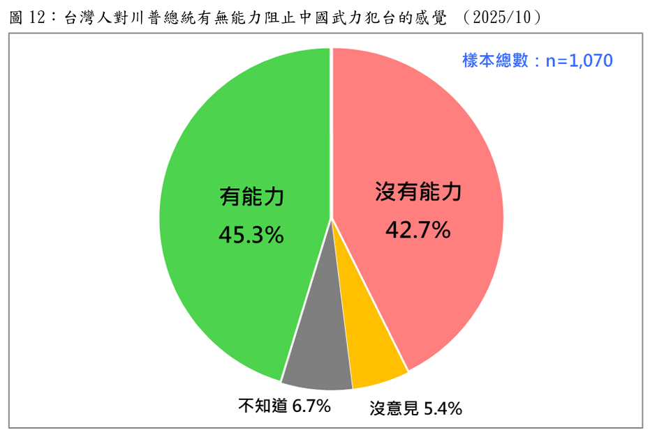 超過4成5民眾認為,川普有能力阻止中國武力犯台。台灣民意基金會提供