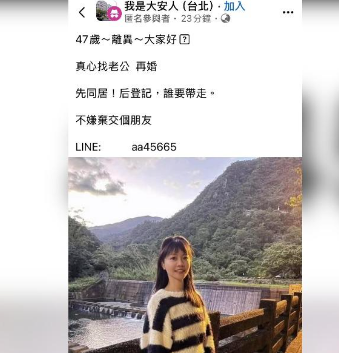 近日有一個匿名帳號在「我是大安人」臉書社團,貼出高嘉瑜生活照,並寫下「47歲離異,大家好,真心找老公,再婚,先同居!後登記,誰要帶走。不嫌棄交個朋友。」文末甚至還附上line ID,一切看似煞有其事。
