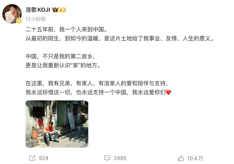隨後矢野浩二(浩歌)也於18日在微博發文表示,他在25年前去到中國,「從最初的陌生,到如今的溫暖,是這片土地給了我事業、友情、人生的意義。」認為中國不只是自己的第二故鄉,更是他重新認識「家」的地方。