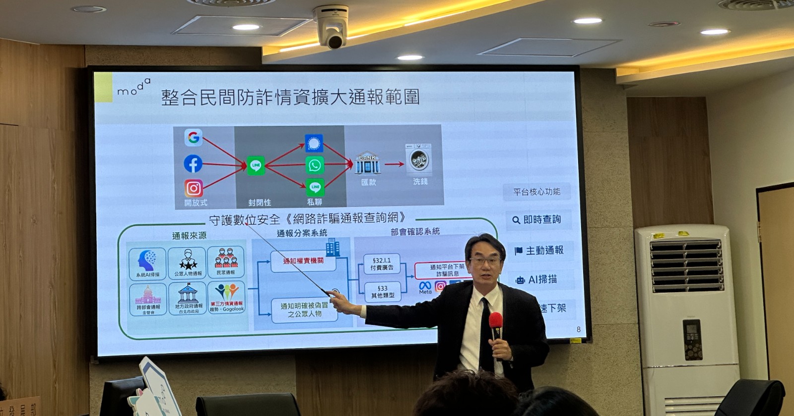 林宜敬繼續指出,數發部一旦接獲通報,就會立即確認。他舉例,倘若是假冒輝達執行長黃仁勳的訊息,我們就會去問黃仁勳的秘書,秘書會告知「這不是黃仁勳本人,此為詐騙。」數發部就會立刻啟動網詐通報查詢網的自動機制,請Meta、Google或是LINE盡快將詐騙訊息下架。