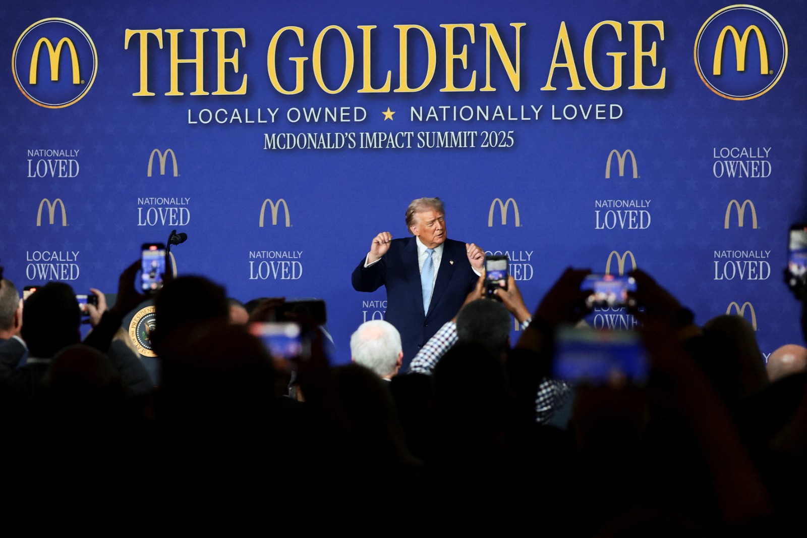 川普週一在華府參加麥當勞加盟主、供應商聚集的麥當勞大會。他先吹噓自己重返白宮後,成功提高美國人的實質收入並促進經濟成長。但川普也坦承,許多政策仍需要一段時間才能發揮功效。他說:「身為總統,我每一天都在為你們這些小型企業主努力奮鬥。仍有很多工作得繼續,但我們已達成非常大的進展。」