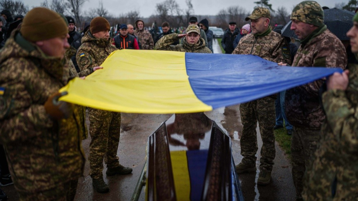烏克蘭中部城鎮霍斯托梅爾的民眾,11月22日為一名陣亡軍人舉行葬禮,在棺木上覆蓋烏克蘭國旗。美聯社