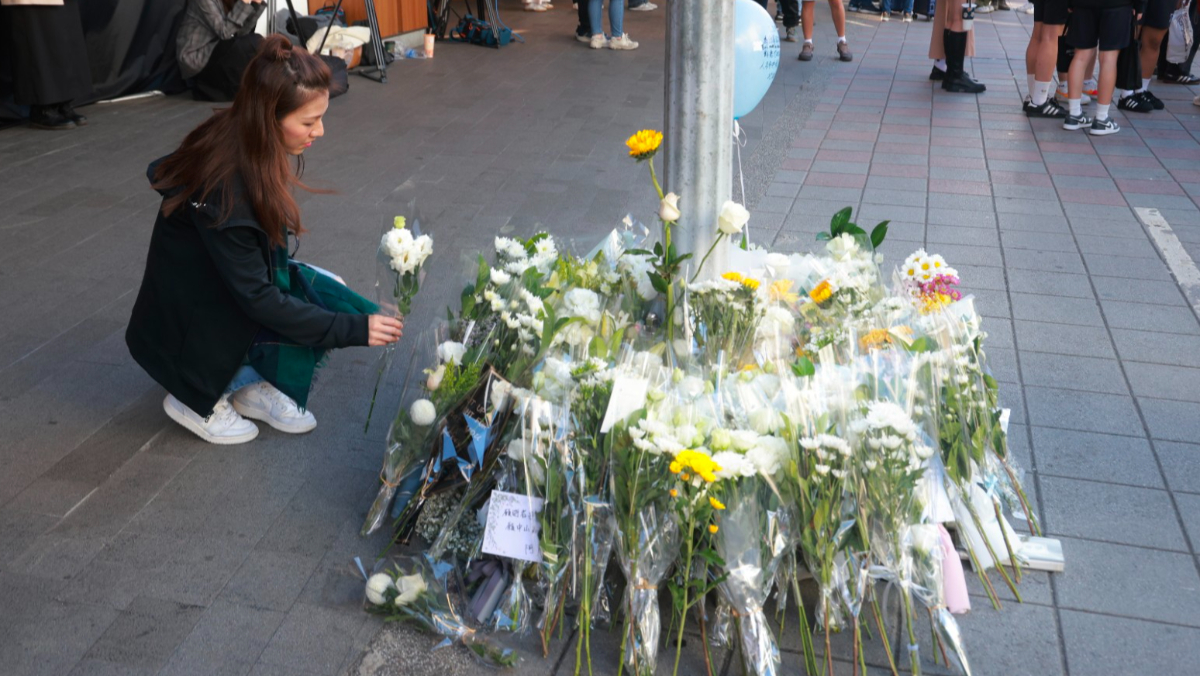 張文隨機攻擊案發生隔天,民眾到捷運中山站1號出口獻花,周邊有警力戒備。李政龍攝