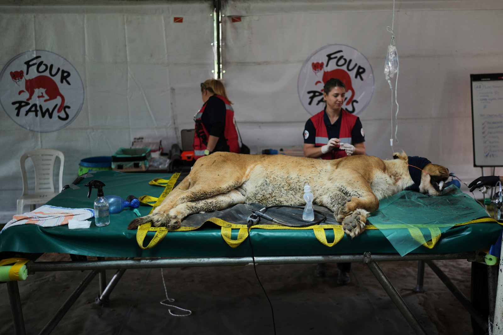 「四爪」醫療團隊上月底到園內為62隻獅子、老虎進行醫療檢查,這是牠們5年來第一次看醫師,有的接受靜脈注射補充營養液、抗生素和止痛藥;很多檢查演變為緊急手術,如一隻母獅因陰道腫瘤開刀,幾隻老虎和獅子的斷齒要根管治療,還有一些因在簡陋籠舍太久,爪子向內生長,也都需要外科處置。