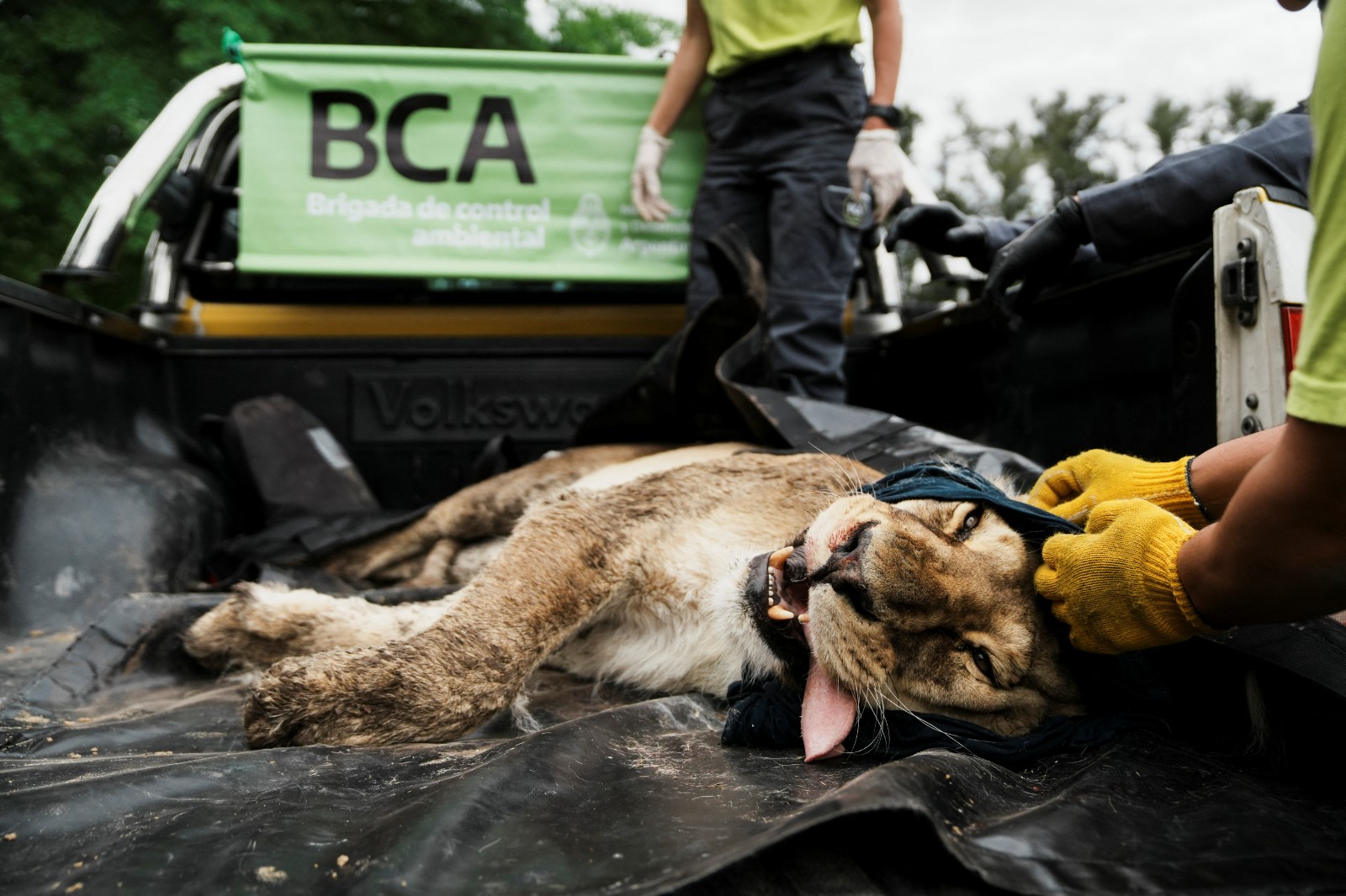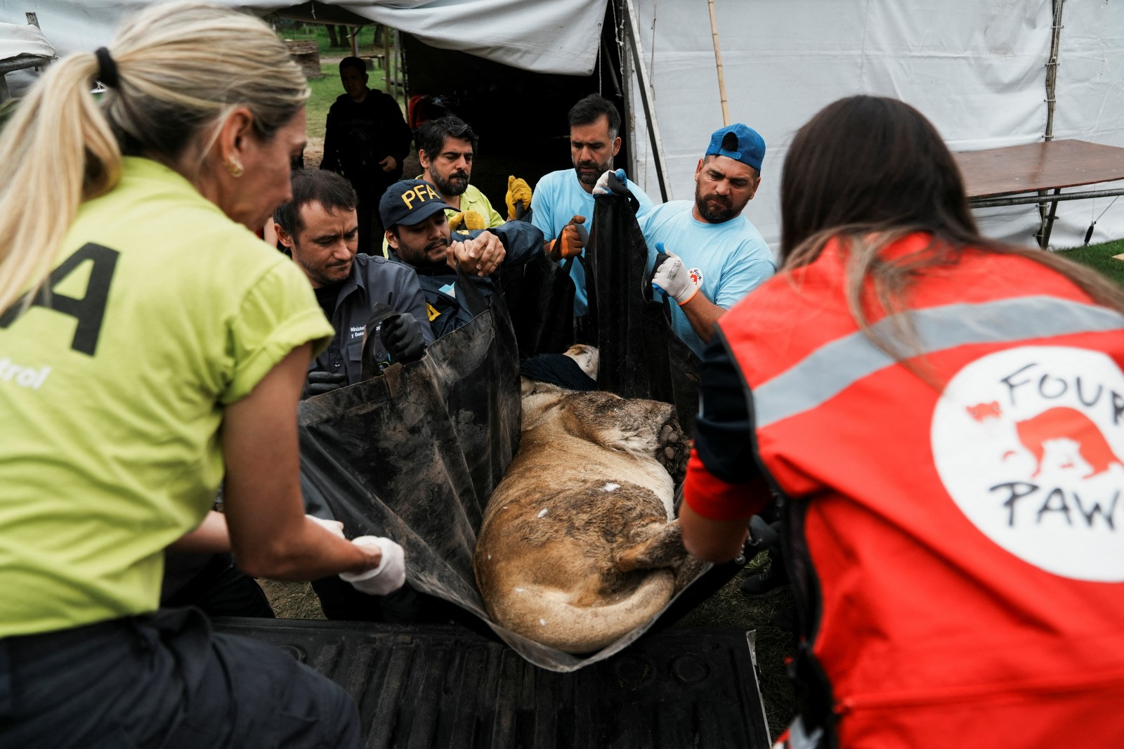 2025年10月30日,動物救援團體人員和阿根廷警方、環境部官員,一同搬運一隻剛接受治療的母獅回到獅籠。路透社