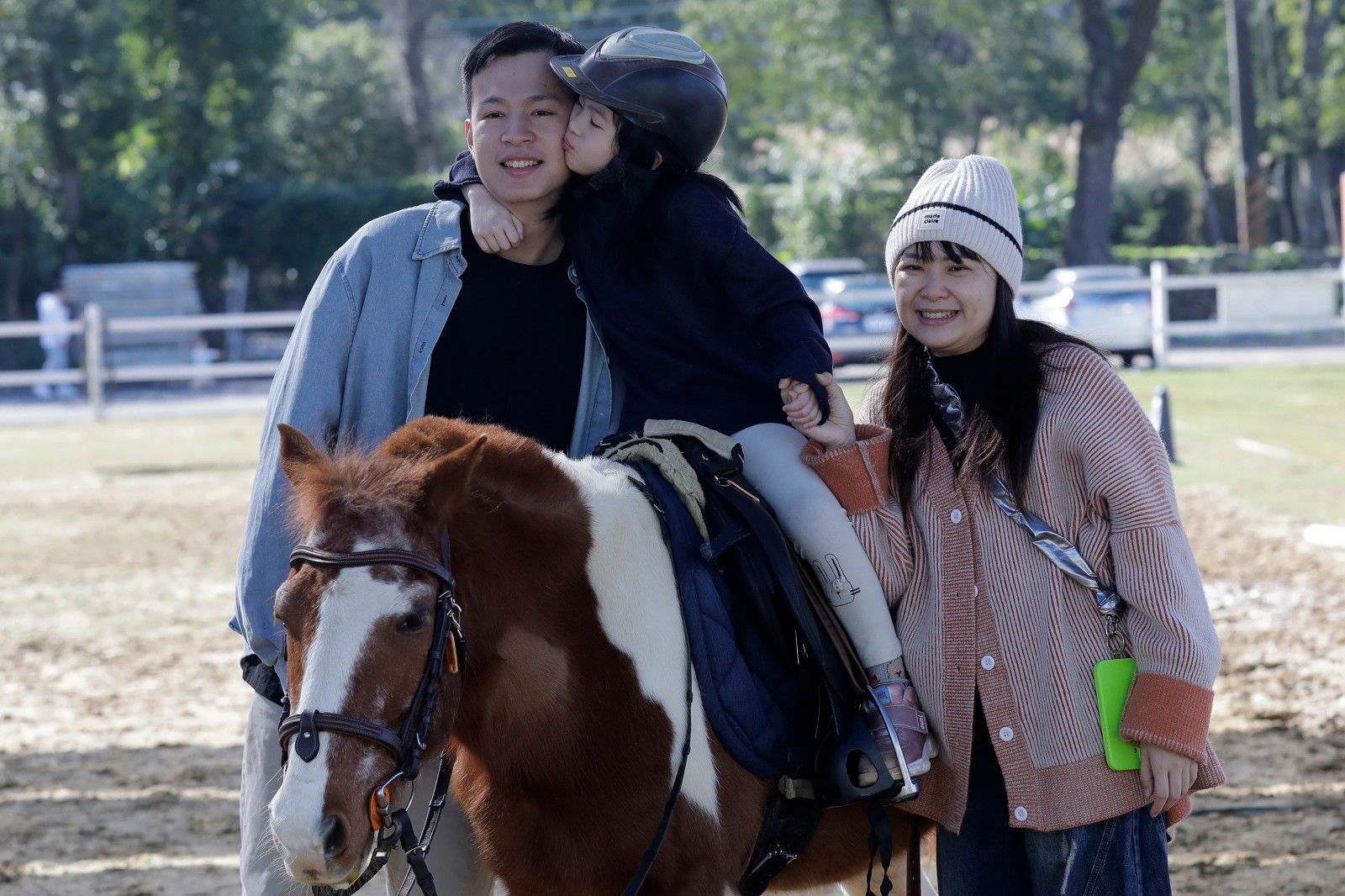 5歲的Ayah在龍潭「希望馬場」,在爸爸媽媽陪伴下接受馬術治療。美聯社