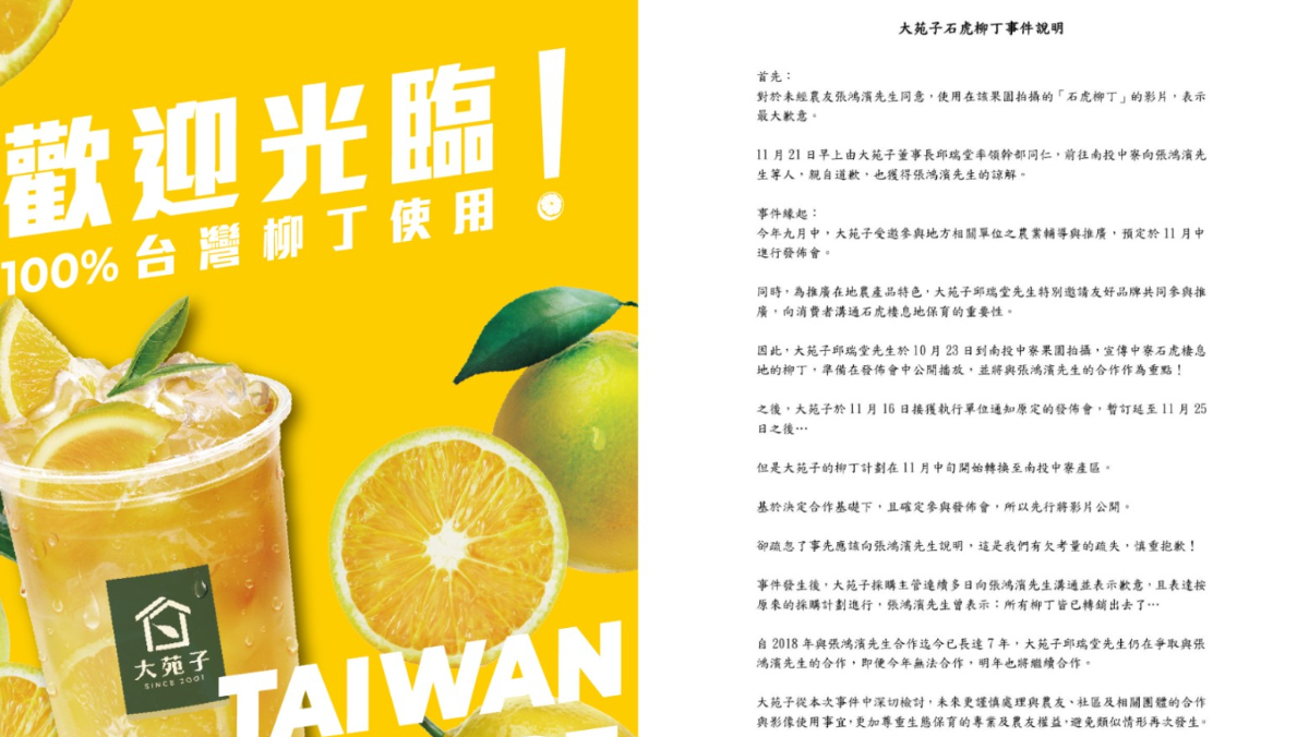連鎖手搖飲大苑子近日以「石虎柳丁」宣傳新商品,卻被農場指控「一顆石虎柳丁都沒買」,還被發現已經註冊「石虎柳丁」商標,引發公關危機。大苑子昨為了滅火,緊急聲明下架石虎柳丁的商標圖文申請,董事長邱瑞堂今天(11/21)更率領幹部親自南下向農民道歉,希望平息風波。