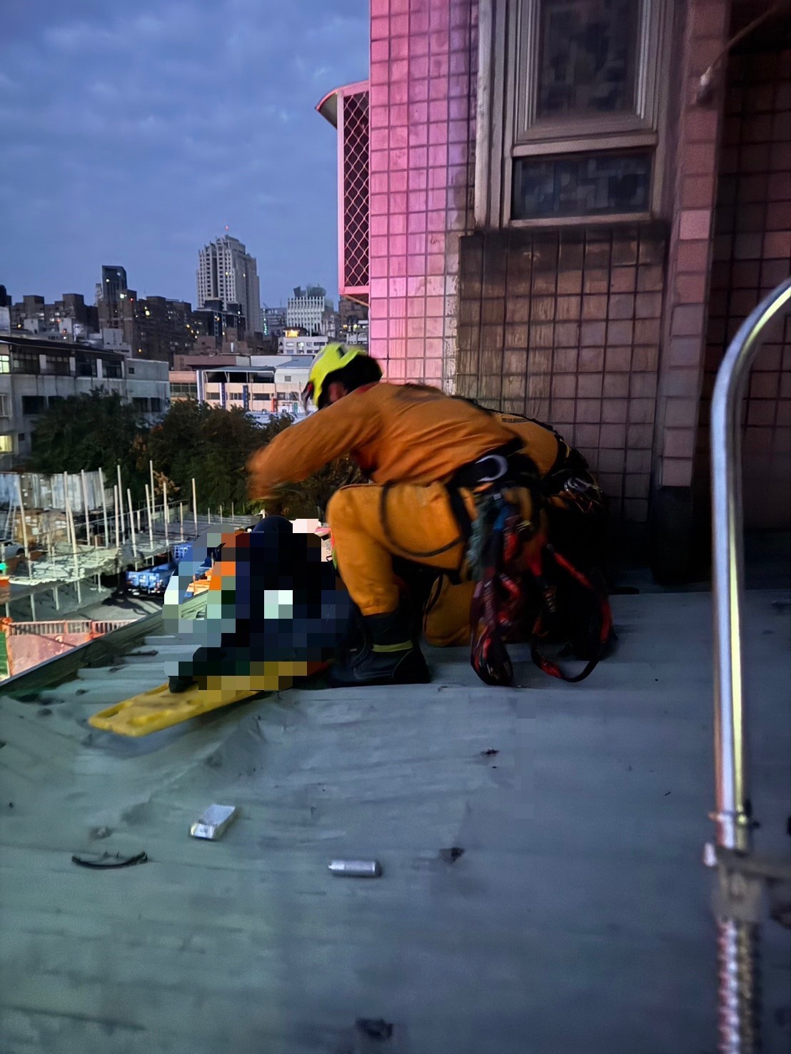 男子從住家8樓掉到鄰居3樓鐵皮屋頂,消防局出動人員救護。讀者提供