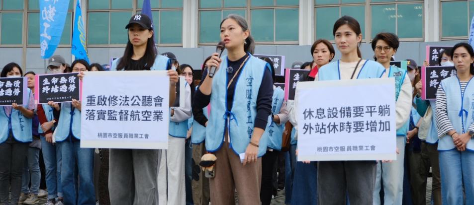 長榮一名空服員日前抱病執勤,返國後不幸離世;桃園市空服員職業公會今(11/14)號召上百人前往民航局抗議,抗議法規讓空服員輪休1小時就可工作20小時等規定,提出5大訴求並要求重啟修法公聽會;民航局回應,研議可行方案。