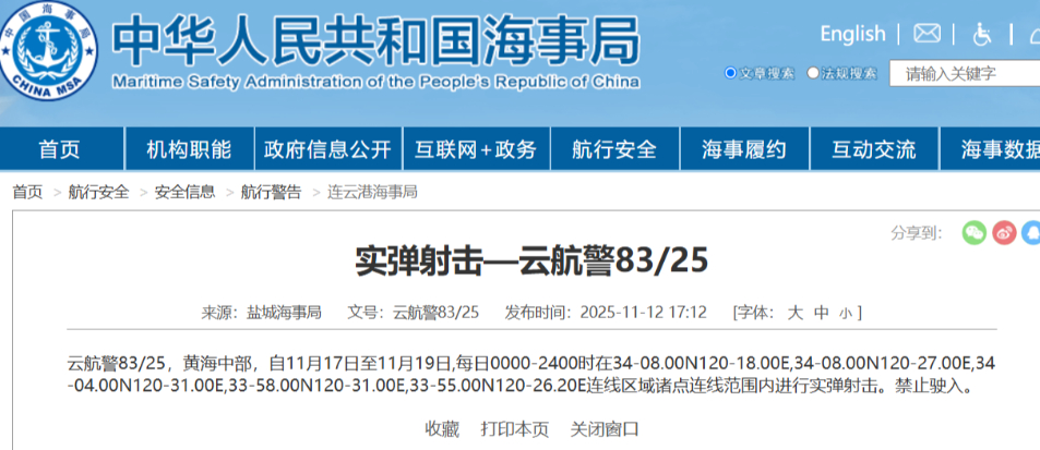 中國海事局官網15日突發布航行警告,宣布17至19日連續3天,全天將在黃海中部部分海域進行實彈射擊。因為日本首相高市早苗「台灣有事」相關發言,以及中國駐大阪總領事薛劍「斬首」說,中日關係更加緊張。中國此時發布海上實彈射擊公告,引發聯想。