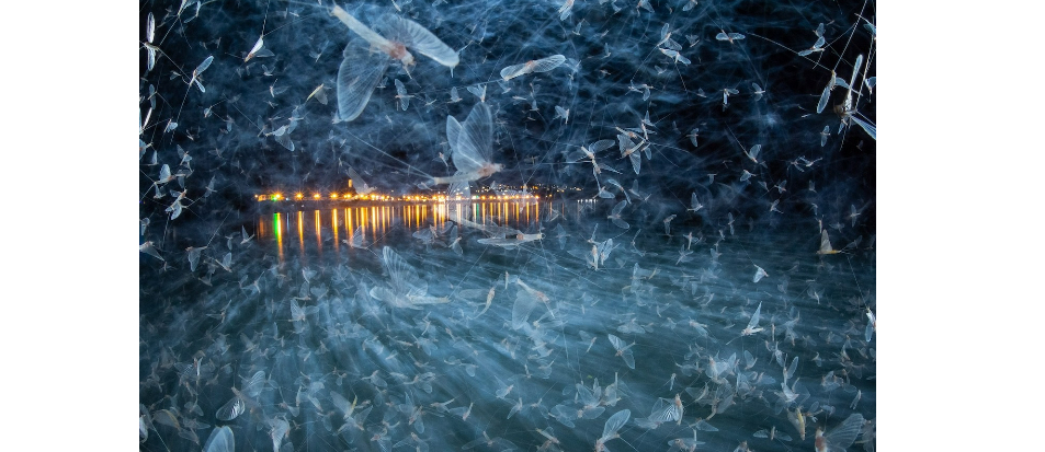 攝影獎「年度特寫攝影師」本月公布得獎名單,匈牙利攝影師在多瑙河畔拍下數以百萬計、幽靈般的漫天蜉蝣朝小鎮亮處衝飛,獲得「昆蟲」獎項首獎,畫面壯觀卻暗藏保育隱憂。波瀾攝影師鏡頭下,一隻善狩獵的貓蛛一次抓了3隻白蟻揣在懷中,獲得「蛛形綱」獎項首獎。