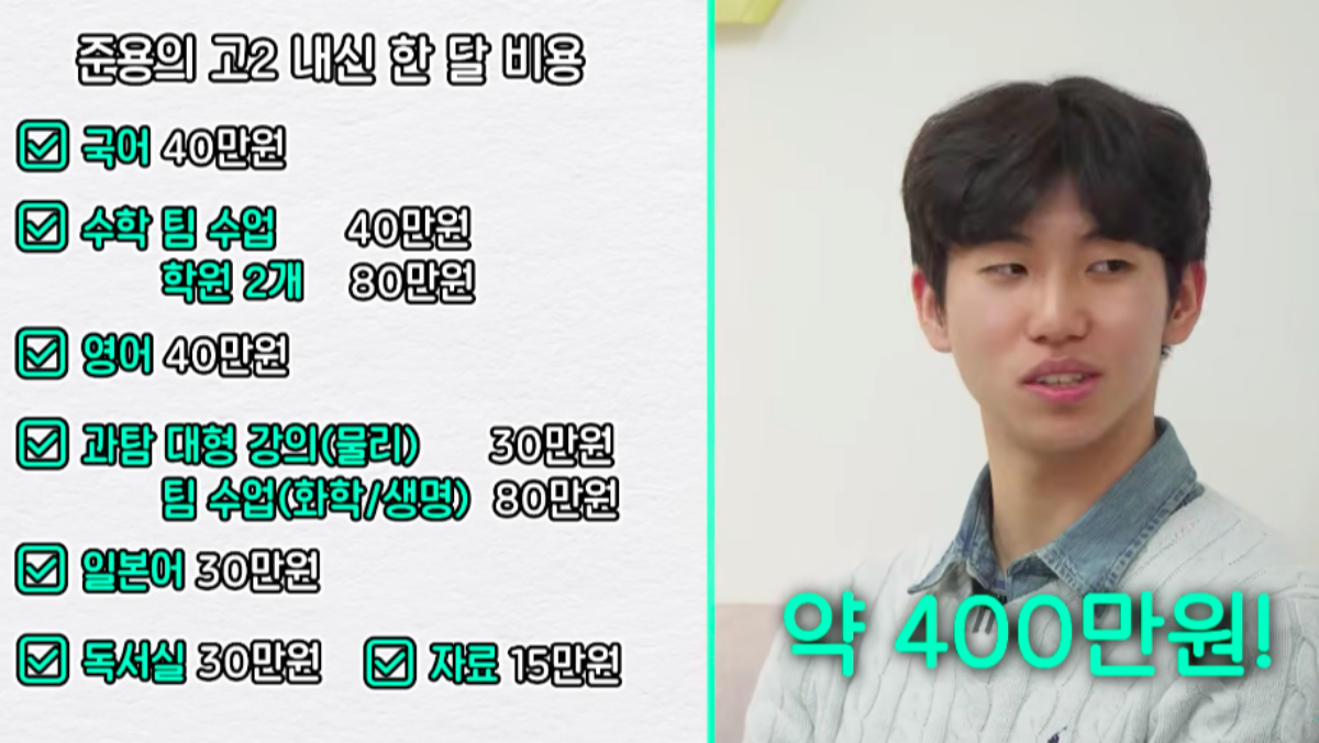 據南韓媒體今天(4/6)報導,許多南韓學子為了考上理想志願,補習成為必要之路,一名首爾大學牙醫系學生在節目上分享,自己高中時期的補習費,曾一個月超過10萬元台幣,同時要上9門補習課程,令外界相當驚訝。