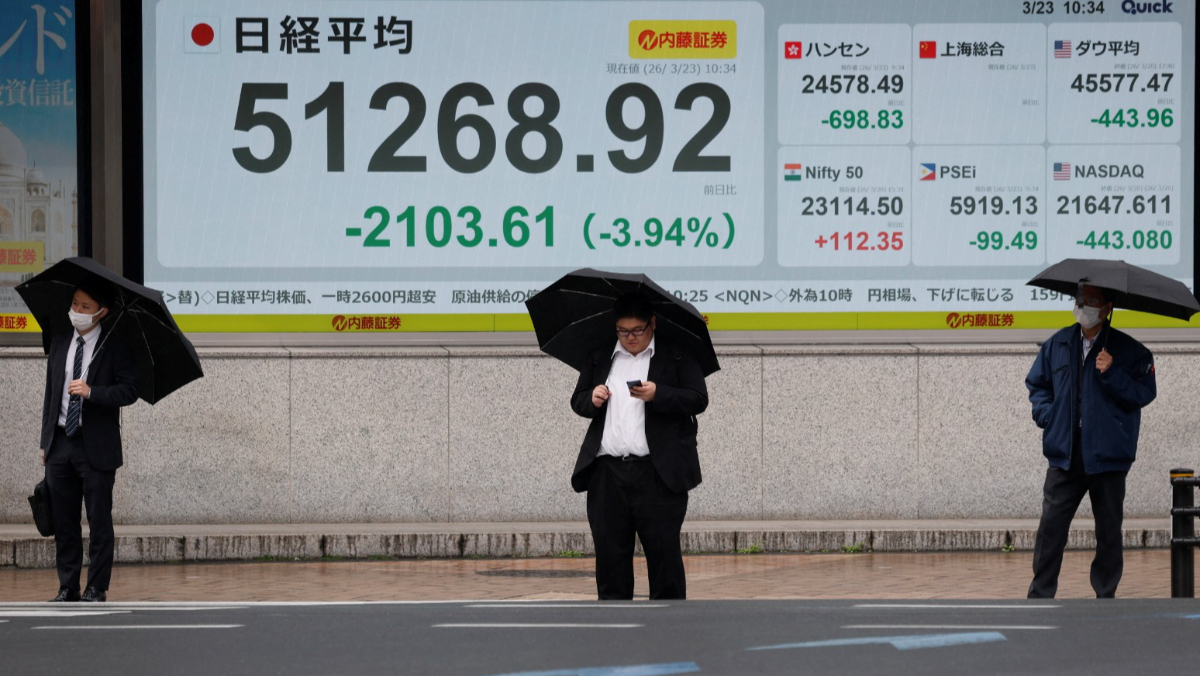 受到中東局勢恐進一步推升油價的恐慌影響,亞洲股市今日(3/23)紛紛暴跌。日經指數開盤一度下挫2500點,收盤時稍微收窄跌幅。南韓證交所一開盤時便觸發邊車機制,暫停交易5分鐘,收盤時則大跌逾6%。