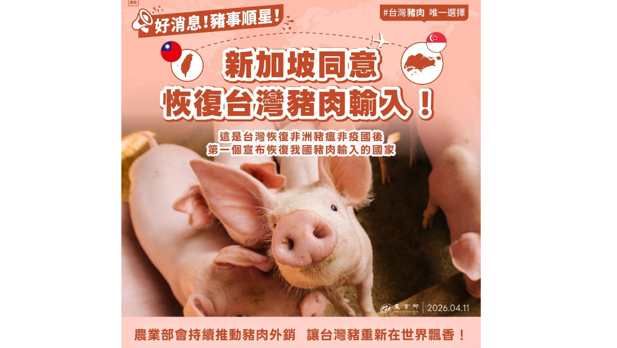台灣4月6日正式恢復非洲豬瘟非疫國地位,世界動物衛生組織在官網上宣布台灣通過申請後,農業部防檢署隨即接獲駐新加坡代表處通報,新加坡已正式恢復我國生鮮豬肉輸銷,成為疫情過後第一個宣布重新開放台灣生鮮豬肉輸入的國家。