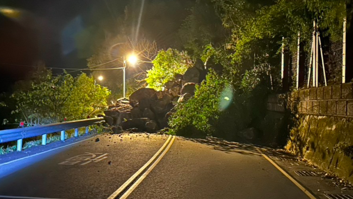 新北市烏來區10日凌晨2時許,在台九甲12.4公里處發生土石坍方,巨石砸落,險象環生。新店警分局獲報,通報中和工務段前來協助盡速排除狀況,由3名警力協助管制中。
