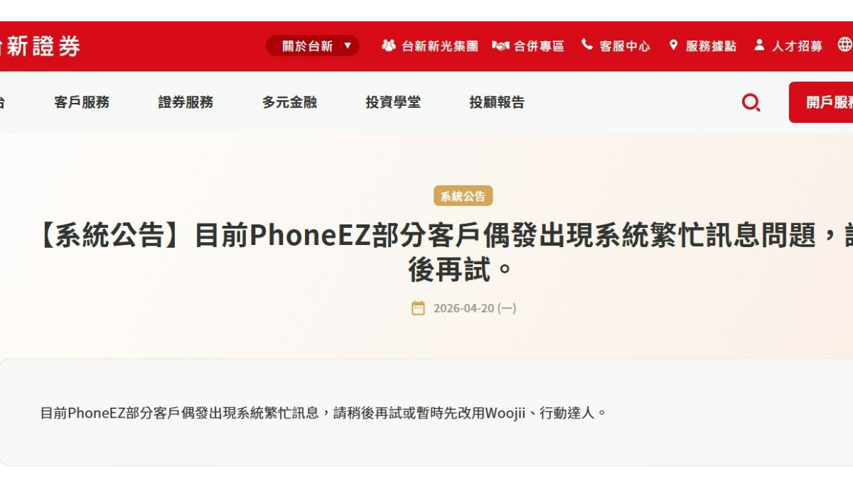 台新新光金(2887)旗下台新證券與元富證券完成合併後系統整合問題頻傳,繼本月7日與14日接連出現異常後,今(20)日再有投資人反映系統顯示「繁忙」,導致中午時段無法登入與操作,在台股創高之際錯失交易時機,引發不滿。