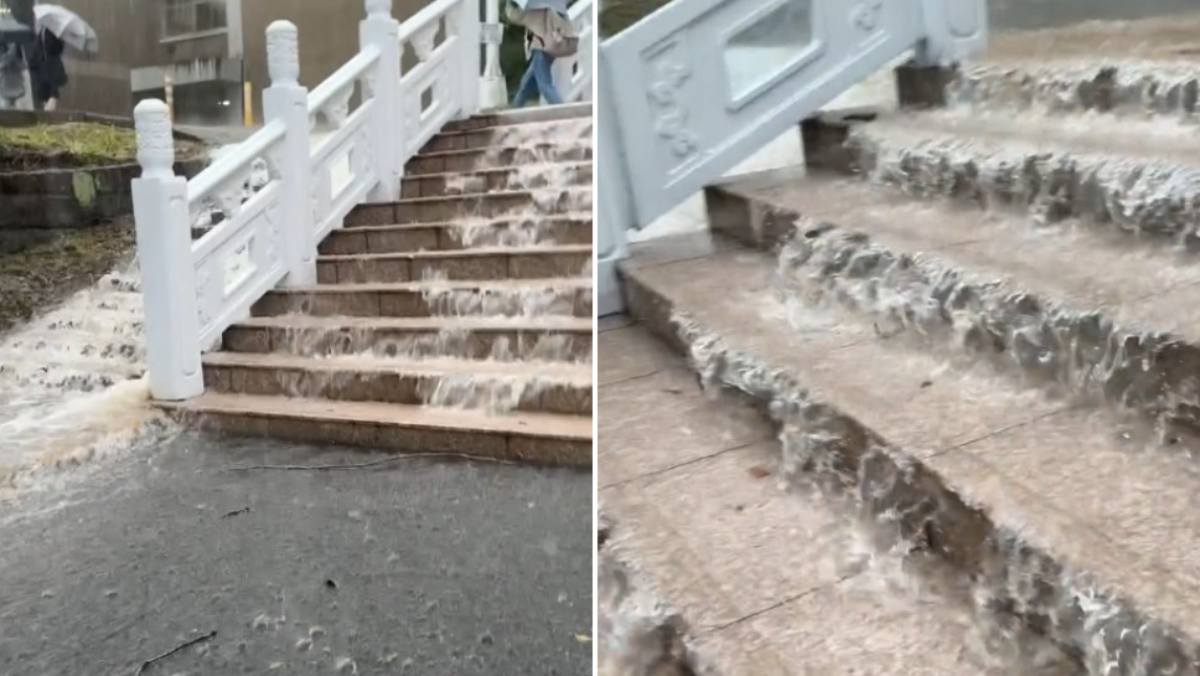 中央氣象署指出,颱風外圍環流與東北季風共伴影響,北部及東部地區降雨顯著,甚至從雨量預測來看,北台灣不少縣市已經達到停班停課標準。今天(10/20)雖然是正常上班上課,但許多北部學校風強雨驟,位在新北淡水區的淡江大學,樓梯被大雨淹成「瀑布」,更有大樓外牆磁磚不明原因砸落,校方也趕緊將部分地區警戒,暫時不讓學生通過。