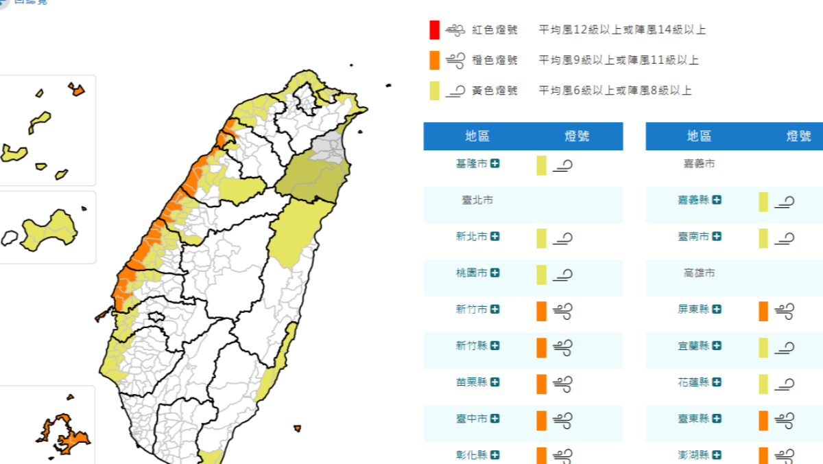 雨彈轟炸北台灣,但強風也不容小覷。東北季風與颱風外圍環流共伴影響,東北季風明顯增強,中央氣象署今天(10/21)16時32分,針對18縣市發布陸上強風特報,持續時間從今天下午至22日晚上,橙色燈號(平均風9級以上或陣風11級以上)共有10縣市;黃色燈號(平均風6級以上或陣風8級以上)共有8縣市,請民眾注意防範。