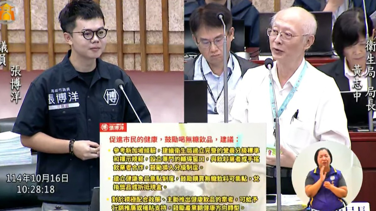 高雄手搖飲店多達2993家,引爆高糖危機。市議員張博洋今(10/16)質詢表示,高雄肥胖率達41.3%,居六都之首,健康排名墊底,建議比照新加坡「Nutri-Grade」制度,推含糖飲料分級標示與誘因政策;衛生局長黃志中回應,將推動無糖飲食教育,並研議設立「無糖標章」。