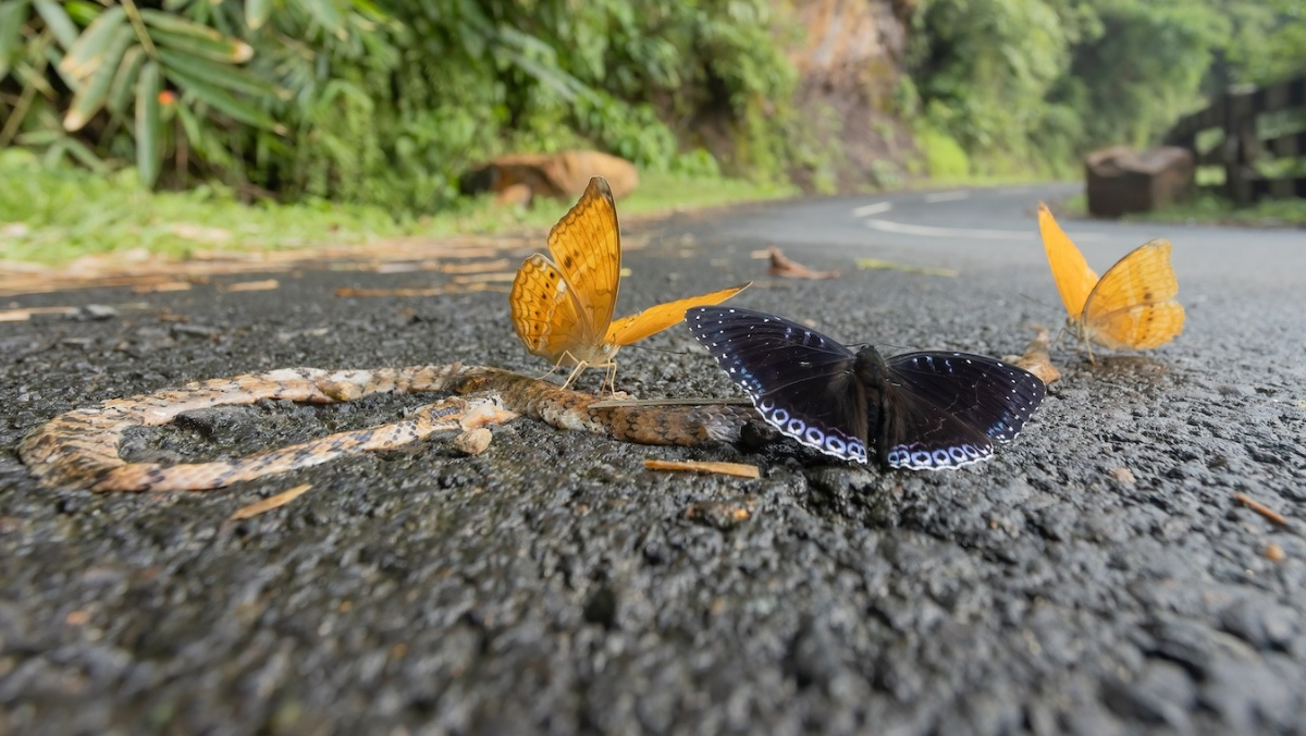 攝影獎「年度特寫攝影師」近日公布「挑戰賽:死亡與腐朽」得獎名單,印度攝影師馬利克拍到遭路殺的蛇,成了彩蝶營養和水分來源;荷蘭攝影師米恩豪特鏡頭下,一枝芽蟲媽媽雖困於蛛網,仍努力生產,趕在死前讓孩子出世,2張同時呈現生與死的照片都入圍挑戰賽優選名單。