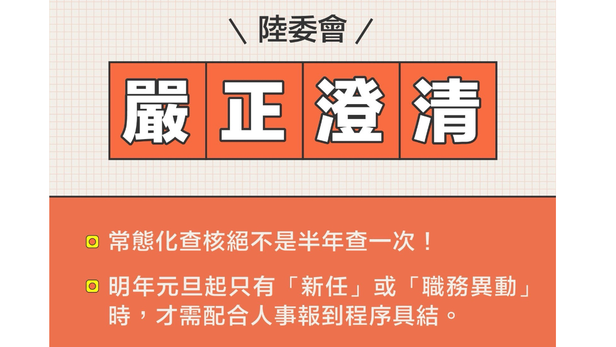 大陸委員會今天(10/04)表示,部分媒體及人士混淆視聽,對外散佈政府未來每半年要清查一次軍公教是否申領持有中共戶籍、身分證、護照、定居證、居住證等假訊息,企圖製造軍公教系統內部不安,挑動對立。政府提出嚴正澄清,自明年元旦起實施的常態化清查,只有在新任或職務異動時,才需配合人事單位填寫調查具結書,從來都沒有每半年就要查核一次的規劃。