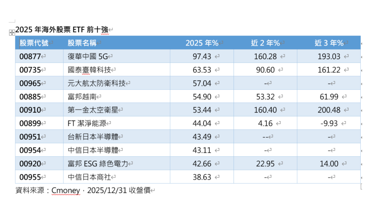 2025年全球股市亮麗封關!12月份及2025年全年度海外股票ETF報酬也出爐,根手金CMoney統計資料,12月漲幅前十強海外ETF,報酬率都在5%以上,其中2024年績效王第一金太空衛星(00910)漲幅高達16.43%、復華中國5%漲幅13.54%,表現最為亮眼;此外,2025全年度海外ETF報酬,則以復華中國5G漲幅高達97.43%最佳,後面依序是國泰臺韓科技、元大航太防衛科技、富邦越南,及第一金太空衛星等,前五強全年度報酬都高達五成以上。