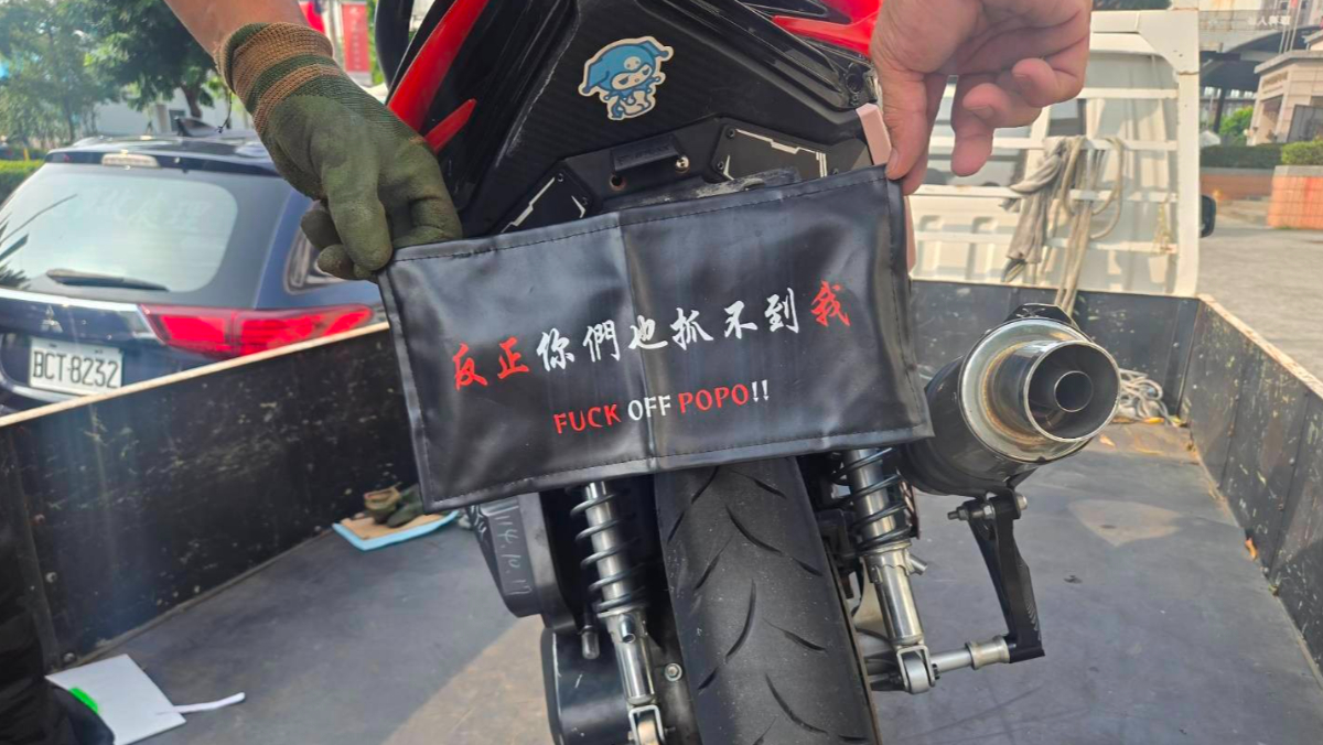 一輛改裝的機車深夜高速行駛,而且排氣聲量異常大聲。台中市警察局五分局員警發現後攔檢,20歲的柯姓女子改裝機車排氣管外,還涉及包括車牌上翹、改裝車燈及後照鏡太小等違規,更令員警傻眼的是,機車車身貼著「那又怎樣 撞柱當隊長」貼紙,另有1塊以黑色皮革製成,印著「反正你們也抓不到我 FXXK OFF POPO!!」員警當場依法舉發取締,並當場移置保管該部機車。