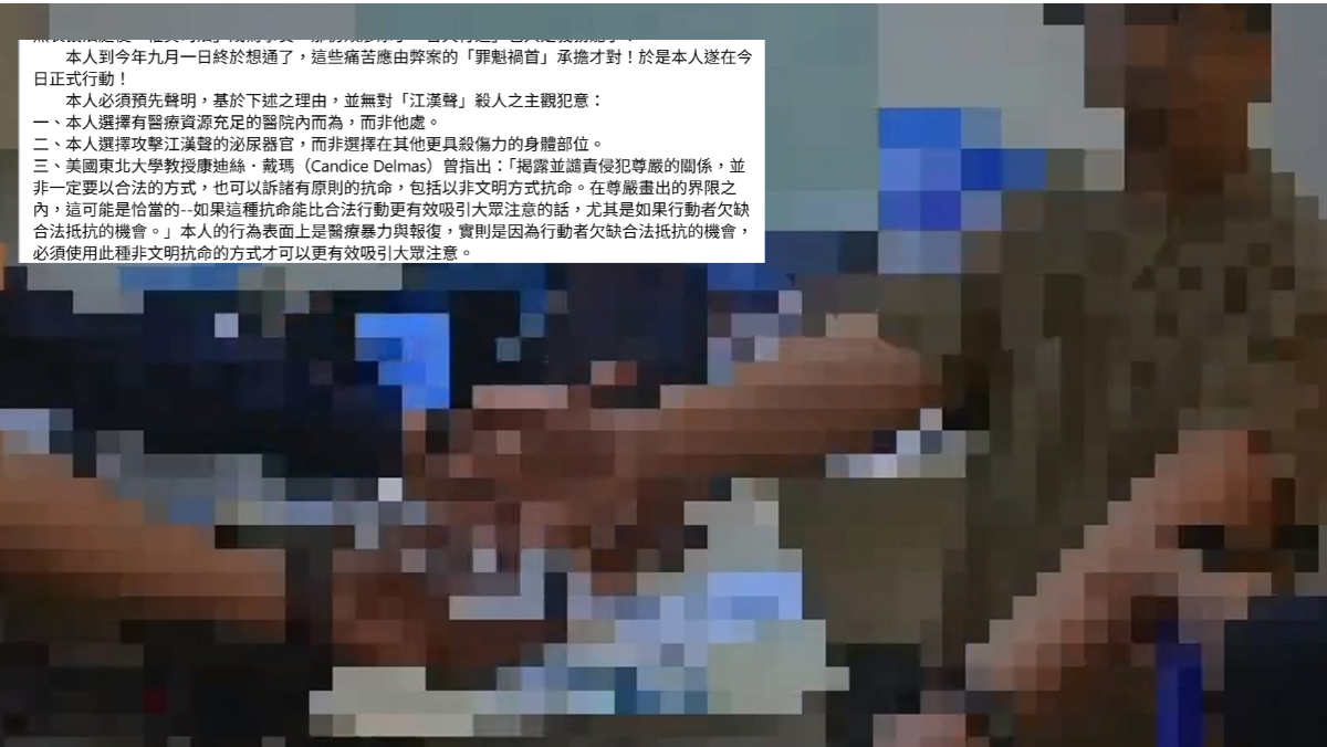 輔仁大學附設醫院今(11/11)下午驚傳醫療暴力,一名30歲男子在醫院門診時突然持美工刀攻擊該院泌尿科名醫江漢聲,造成江的右手腕和左腹部受傷。行兇的曾男當場被醫院保全制伏,並交由林口警分局處理;根據其社群帳號貼文透露,他的行兇動機疑與江漢聲先前被控利用輔大診所名義借款、挪用校產、圖利輔大診所一案被判無罪有關。