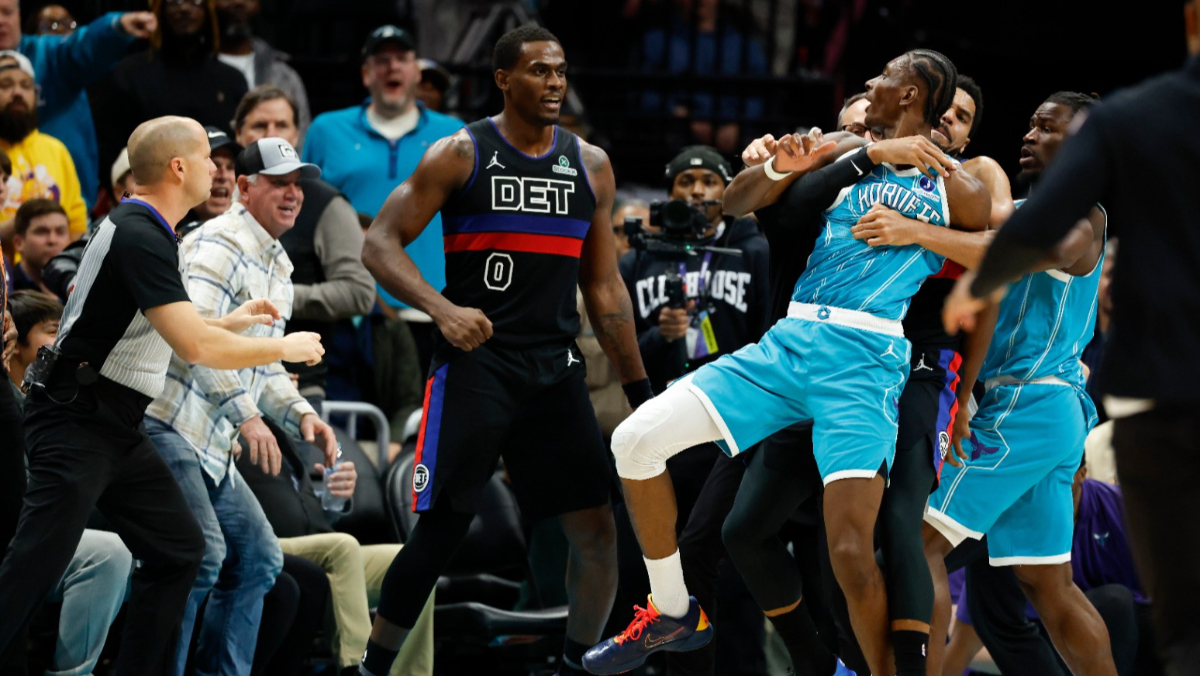 NBA東區龍頭底特律活塞今(10日)作客近況火熱9連勝的夏洛特黃蜂,沒想到兩隊在第3節上演「大場面」重圖場面,雙方4名球員遭驅逐出場,黃蜂總教練Charles Lee也在末節因為不滿裁判判決遭驅逐,終場活塞110:104踢館成功,斷了黃蜂的9連勝。