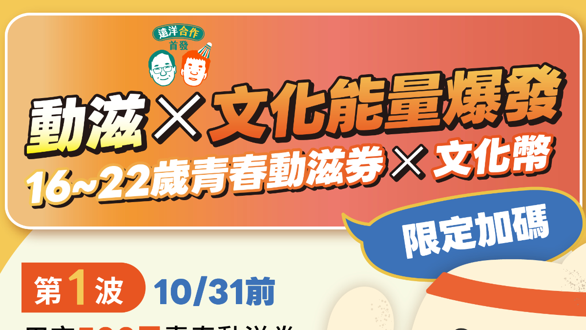 運動部李洋部長與文化部攜手推出首波正式合作「動滋X文化能量爆發」限時加碼,活動分為共有2波任務,第1波任務完成可獲得「200元加碼青春動滋券」及「100點文化幣」;第2波任務完成可再獲得「100元加碼青春動滋券」及「100點文化幣」。