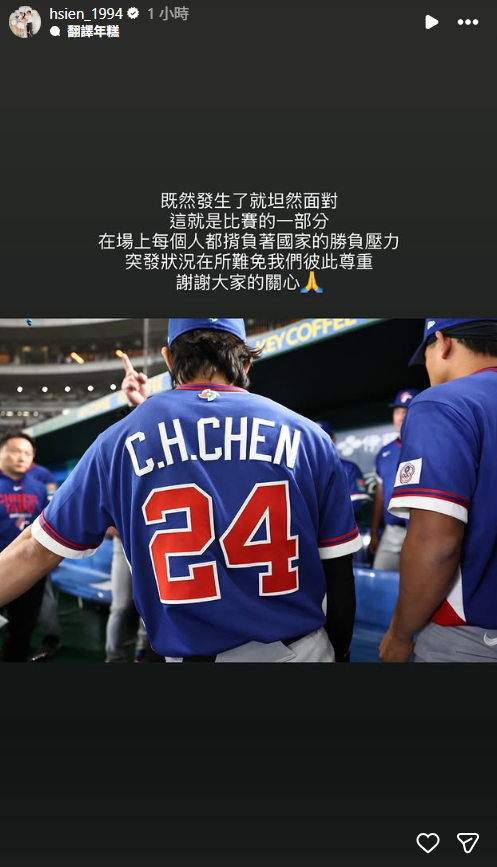 對此,陳傑憲透過IG限時動態發文,「既然發生了就坦然面對,這就是比賽的一部分。」他表示,在國際賽場上,每名球員都背負著代表國家的勝負壓力,場上突發狀況在所難免,希望大家彼此尊重,同時也感謝外界對他的關心。