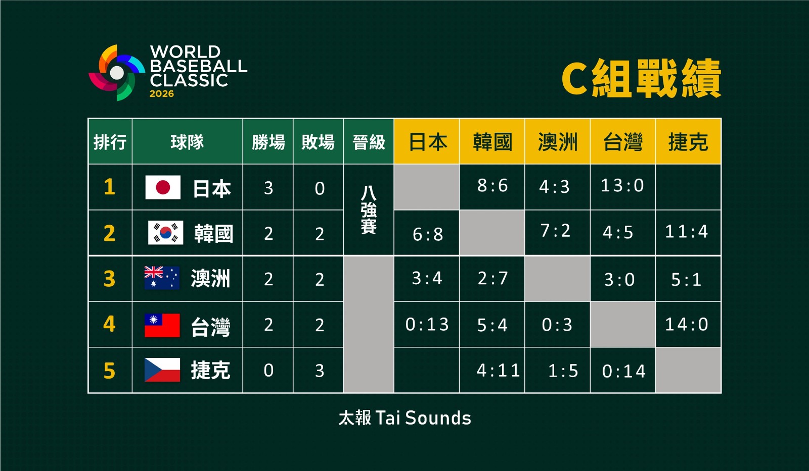 3/9經典賽C組戰績表。太報製圖