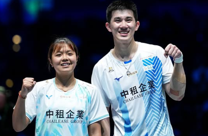 葉宏蔚(右)與詹又蓁(左)奪下全英羽球賽混雙金牌。翻攝葉宏蔚臉書