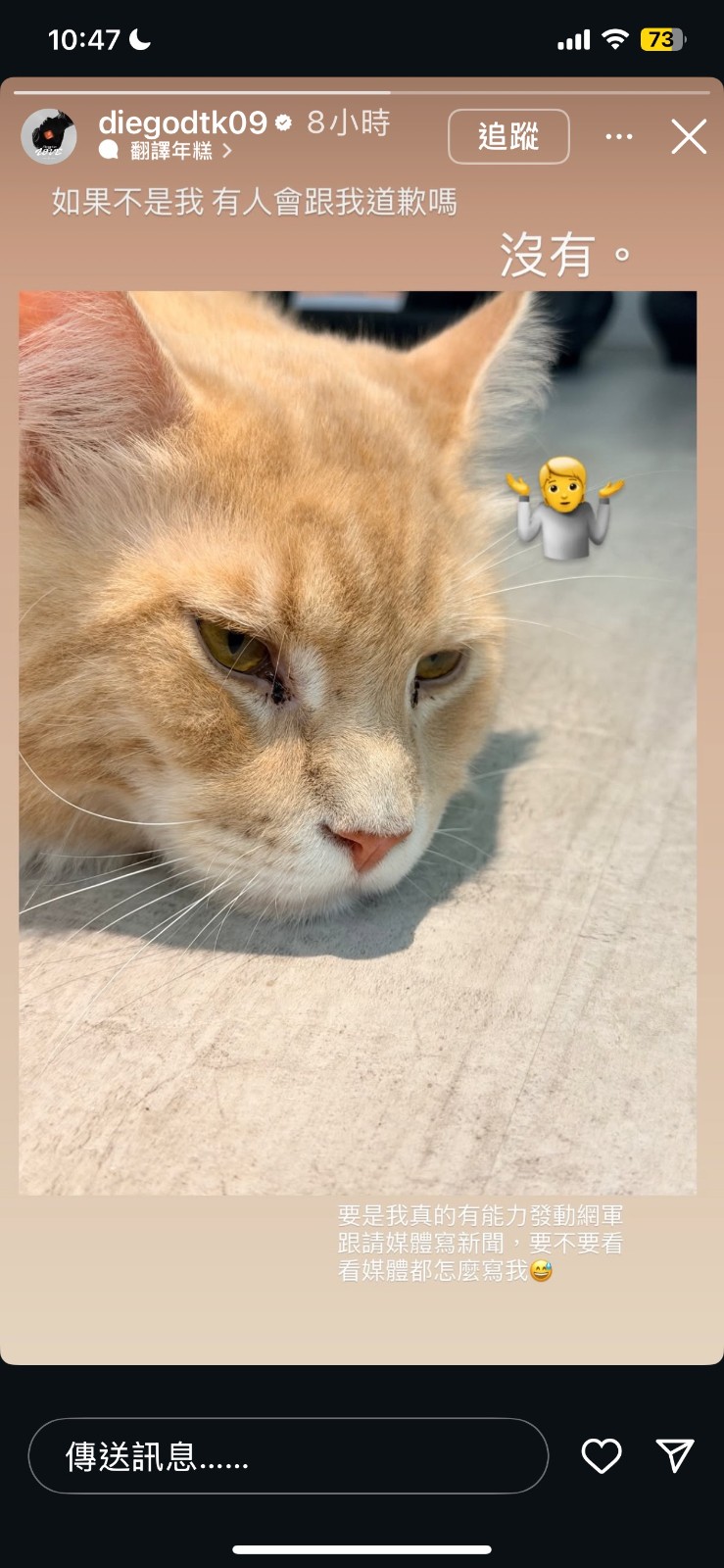 對此,已鮮少活躍社群的陳零九昨日深夜無奈澄清,「如果不是我,有人會跟我道歉嗎?沒有。」他還說,「要是我真有能力發動網軍、請媒體寫新聞,那要不要看看媒體都怎麼寫我?」並附上貓咪厭世臉照片。