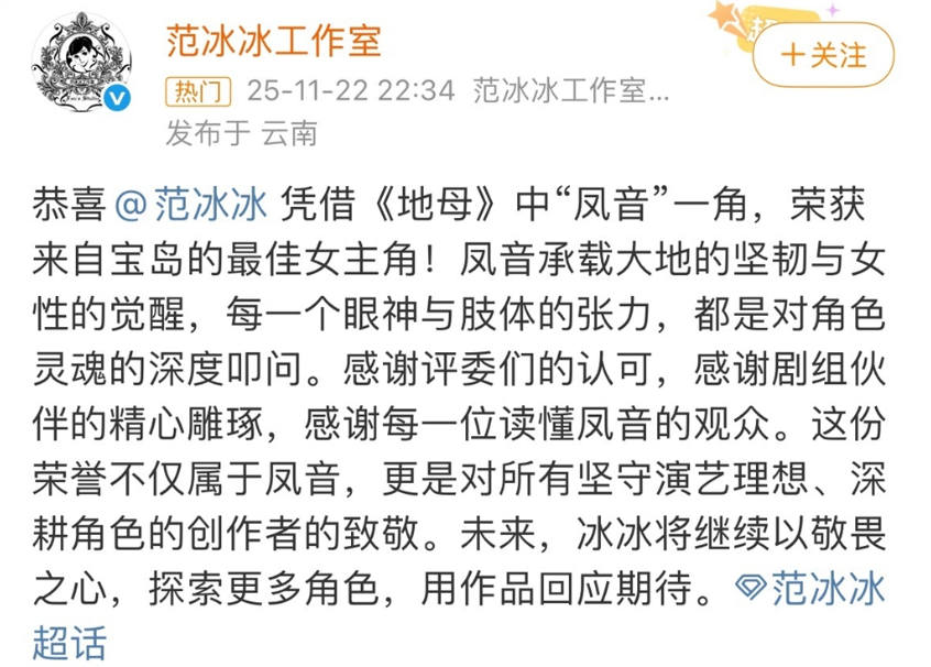 工作室表示,鳳音一角承載了大地的堅韌與女性的覺醒,每一個眼神與肢體的張力,都是對角色靈魂的深度叩問,「感謝評委們的認可,感謝劇組夥伴的精心雕琢,感謝每一位讀懂鳳音的觀眾。這份榮譽不僅屬於鳳音,更是對所有堅守演藝理想、深耕角色的創作者的致敬。未來,冰冰將繼續以敬畏之心,探索更多角色,用作品回應期待」。