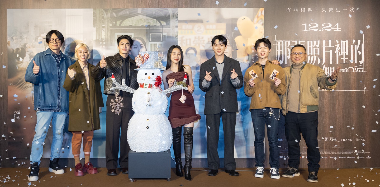 《那張照片裡的我們》導演鄭乃方(左起)、方宥心、宋柏緯、李沐、振永、郭德君、導演湯昇榮與雪人合影。瀚草文創GrX STUDIO提供