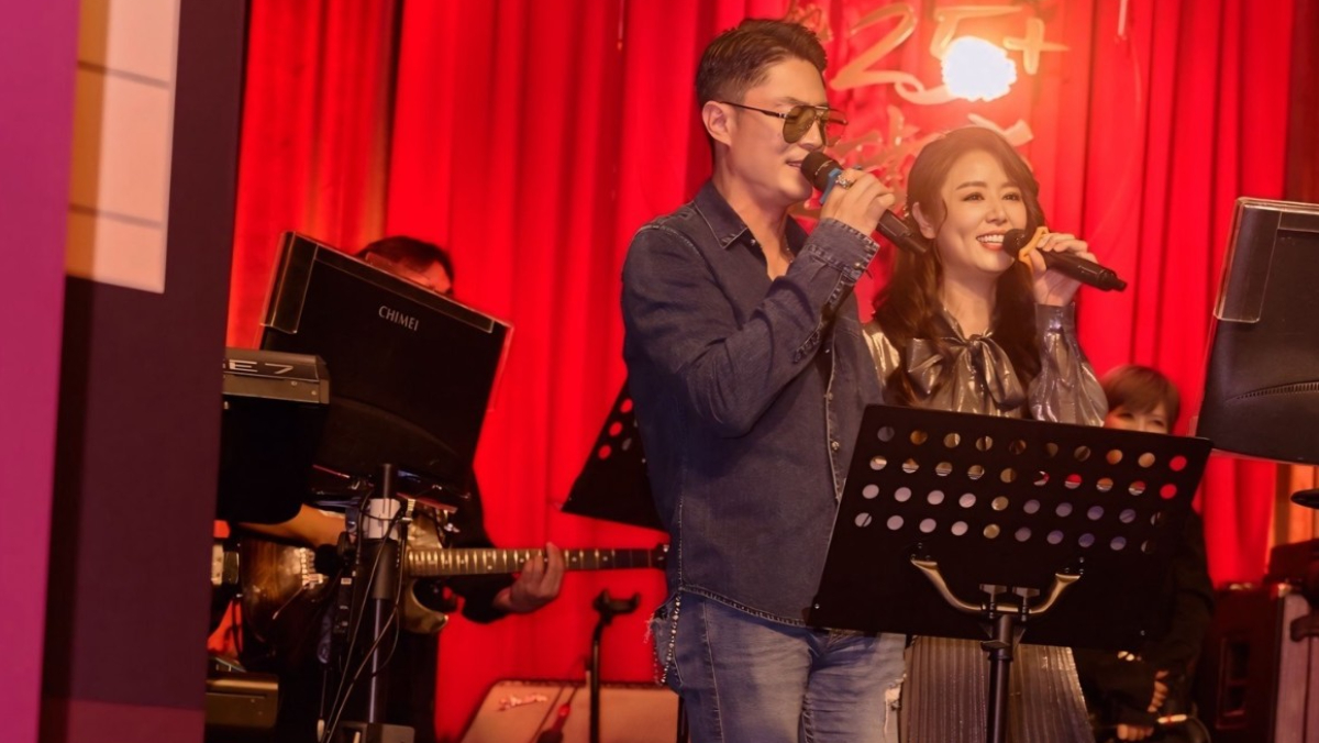 林心如(右)與老公霍建華在台上合唱。翻攝林心如臉書