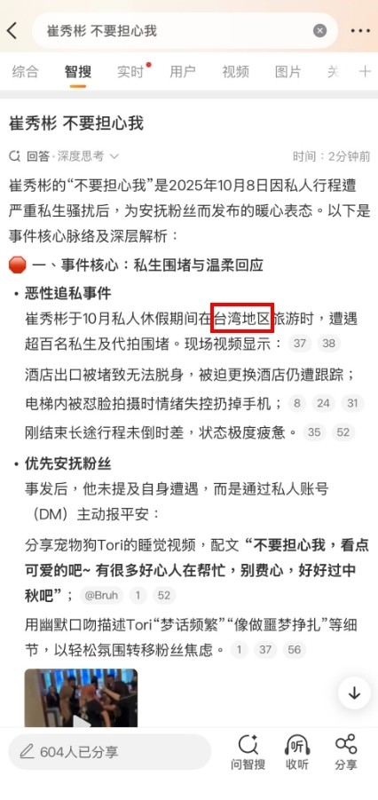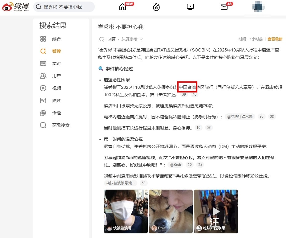 微博AI智能搜尋功能稱秀彬遭私生飯騷擾事件發生在台灣。翻攝自微博