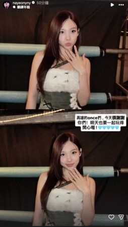 TWICE成員娜璉在演出結束後,以繁體中文發布限動向歌迷致謝,特別的是中文文法相當精準。翻攝自IG@nayeonyny