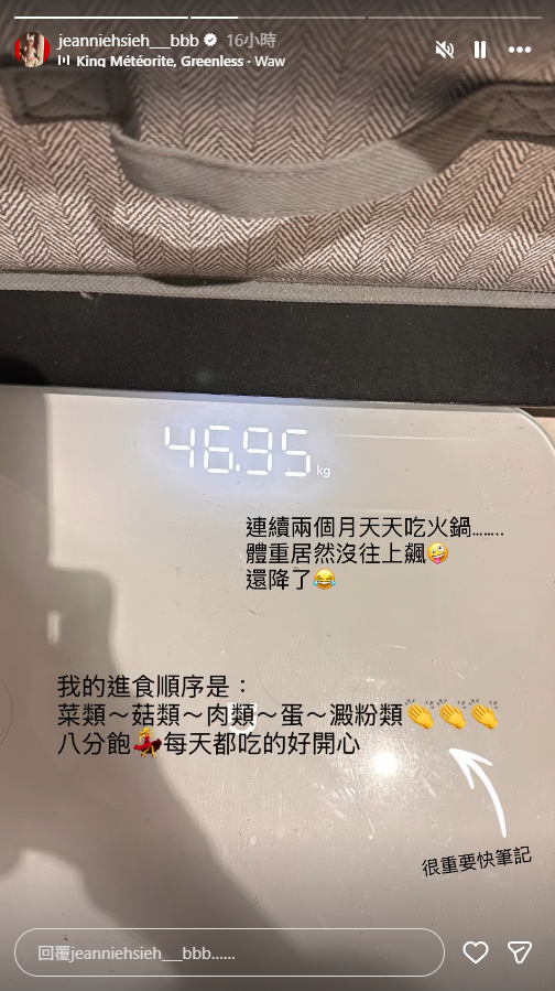 謝金燕在IG分享,她連續兩個月天天吃火鍋,結果體重不增反降。翻攝自IG @jeanniehsieh___bbb