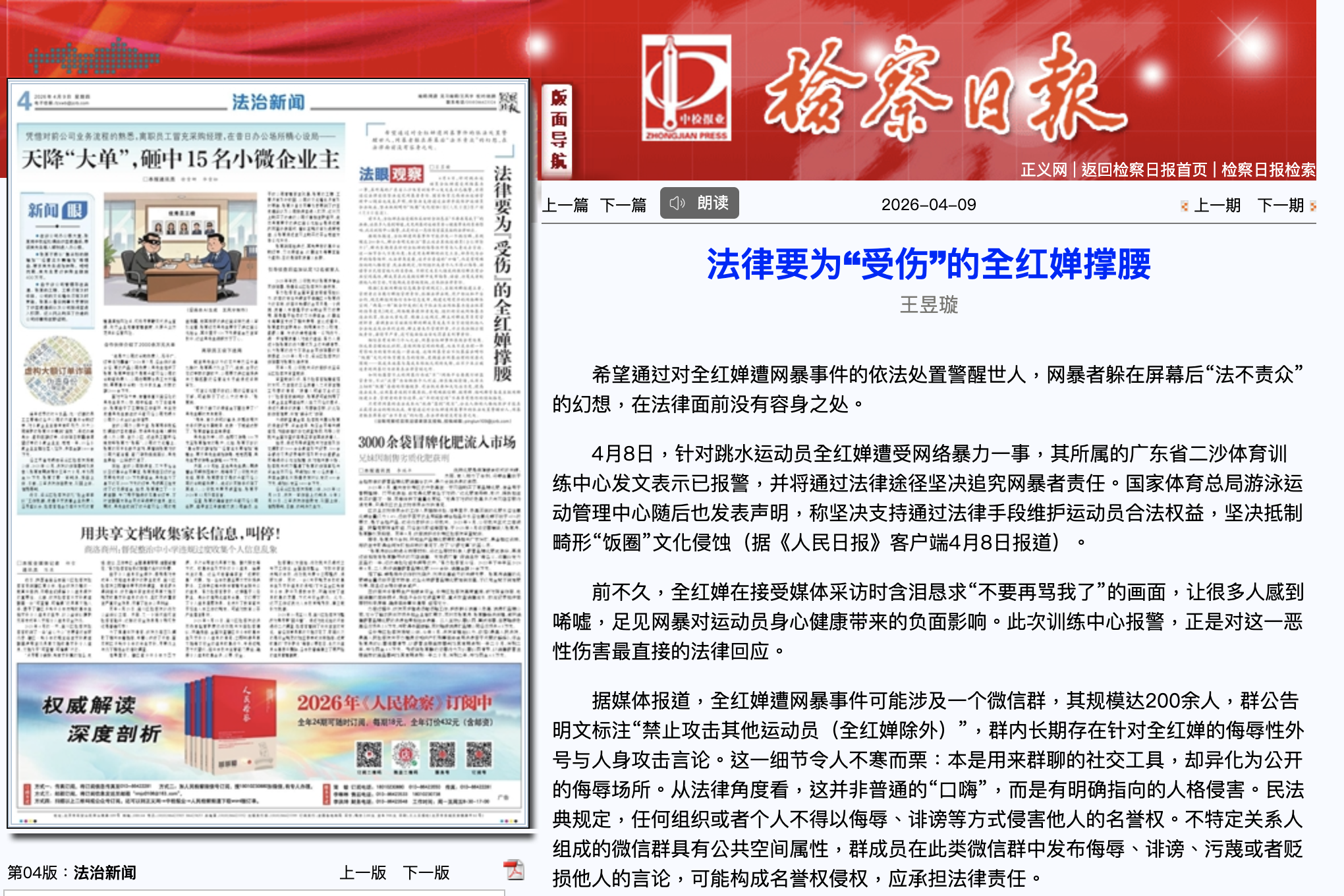 中共官媒《檢察日報》今(4/9)刊登專文談全紅嬋遭霸凌事件。翻攝《檢察日報》網站