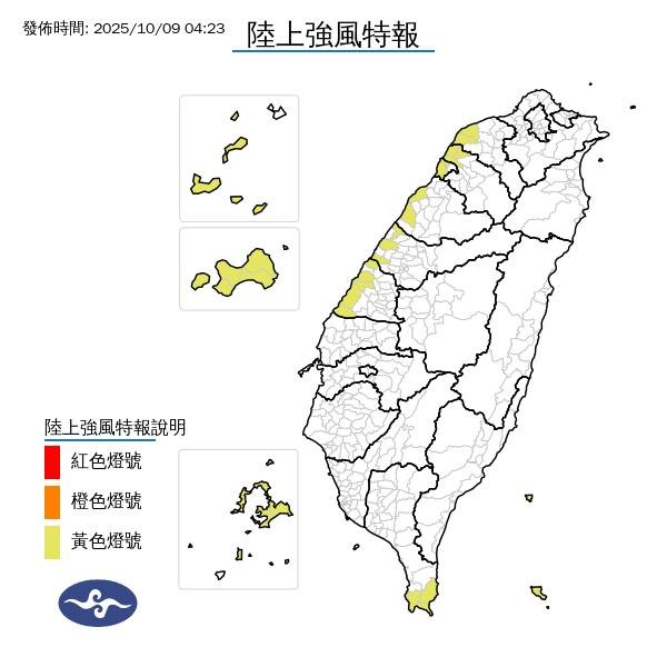 此外,今東北風偏強,氣象署針對桃園至彰化、臺東、恆春半島沿海及各離島局部地區發布陸上強風特報,請民眾留意平均風6級以上或陣風8級以上發生的機率。