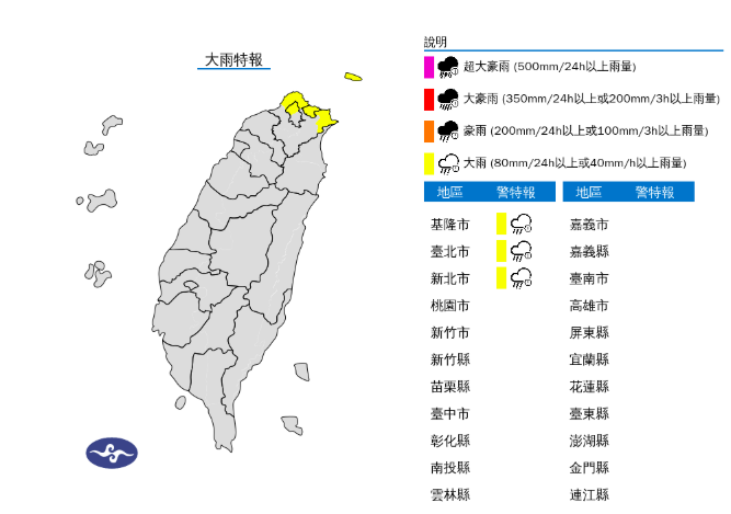 氣象署今早針對基隆北海岸及台北山區發布大雨特報,有局部大雨發生的機率,請注意短延時強降雨及強陣風,低窪地區請慎防積水,山區請嚴防坍方、落石、土石流及溪水暴漲,外出務必小心路況,注意安全。