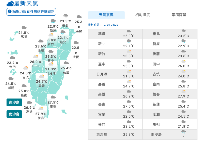 至於之後幾天的天氣,氣象署表示,明天(10/26)東北季風再度增強,北部及東北部天氣轉涼,其他地區早晚稍涼,低溫約22~25度;基隆北海岸、東北部地區及大臺北山區有短暫雨,北部、東部、東南部地區及恆春半島有局部短暫雨,其他地區為多雲,午後南部地區及中部山區有局部短暫陣雨。